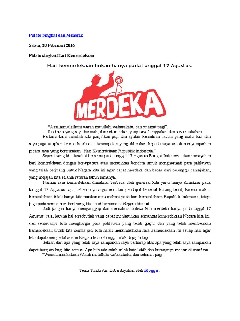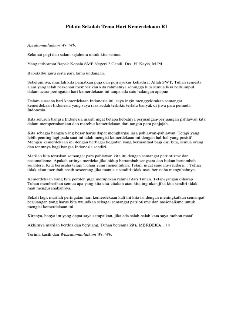 Jenis pidato sangat beragam jika didasarkan pada isi yang disampaikannya. Home pidato contoh naskah pidato singkat makna hari kemerdekaan contoh naskah pidato singkat makna hari kemerdekaan advertisement contoh naskah pidato singkat kali ini mengusung tema hari kemerdekaan ri dan sangat cocok untuk anda sebagai guru yang ingin memberikan pengarahan mengenai peringatan hari kemerdekaan bangsa indonesia.