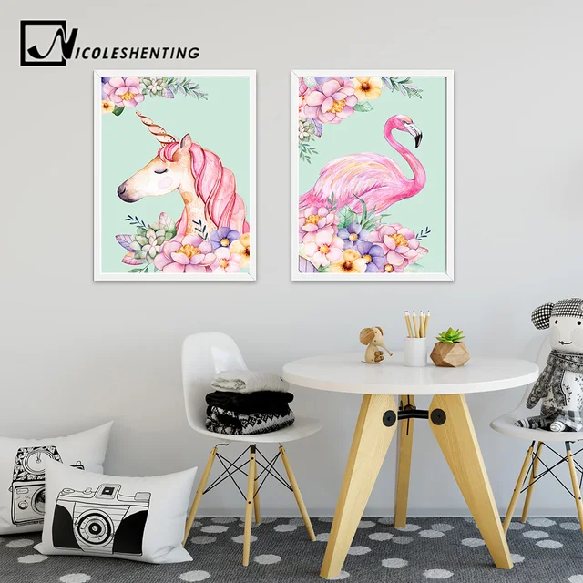 Bunga Unicorn Flamingo Kanvas Poster Nursery Cetak Cat Air Lukisan ...